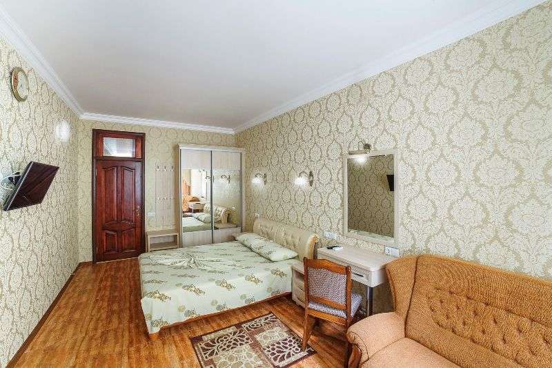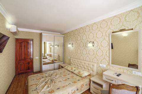 односпальные и двуспальная кровати, диван-кровать, стулья, шкаф, прикроватные тумбочки, туалетный столик, зеркало, кухонный гарнитур, обеденная зона В номере имеется полноценная кухня, утюг, фен.