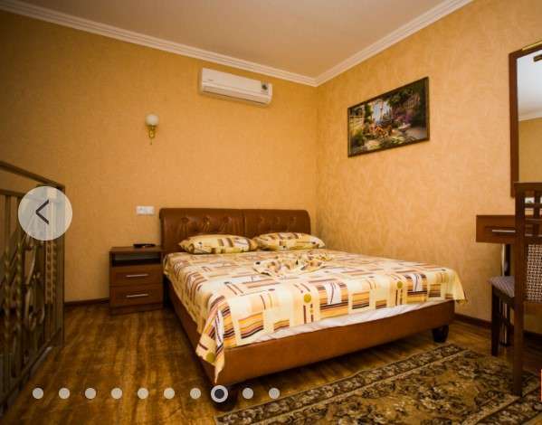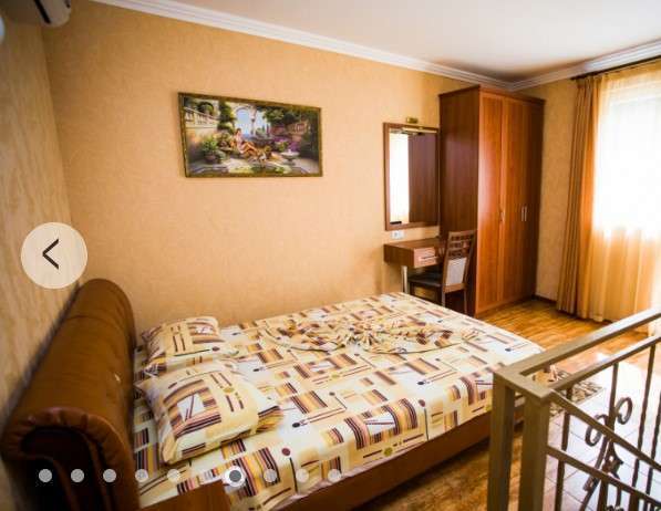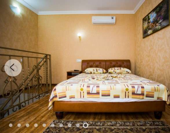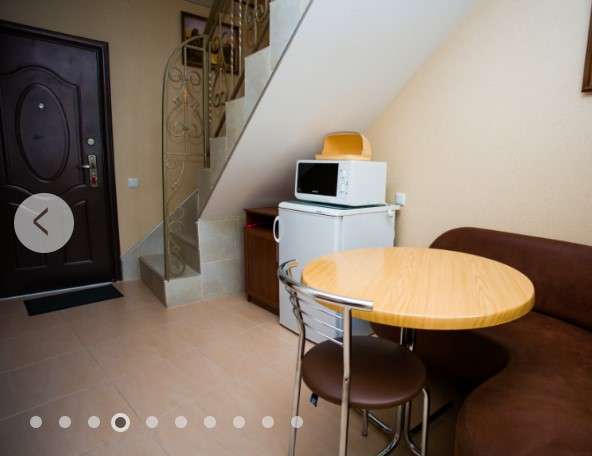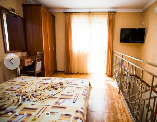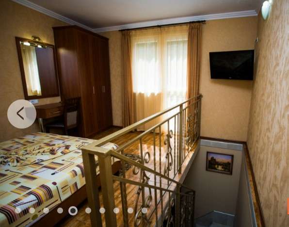двуспальная кровати, диван-кровать, стулья, шкаф, прикроватные тумбочки, туалетный столик, зеркало, кухонный гарнитур, обеденная зона В номере имеется кухня, утюг, фен. Двухэтажное помещение с балкончиком. На первом этаже кухня и санузел и на втором спальня.Вид с балкона на парк.