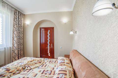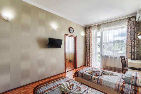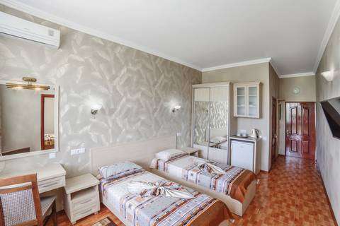 двуспальная кровать, односпальные кровати, шкаф, стулья, прикроватные тумбочки, туалетный столик, прихожая, вешалка, зеркало. В номере имеется эл чайник, мин. набор посуды, утюг.